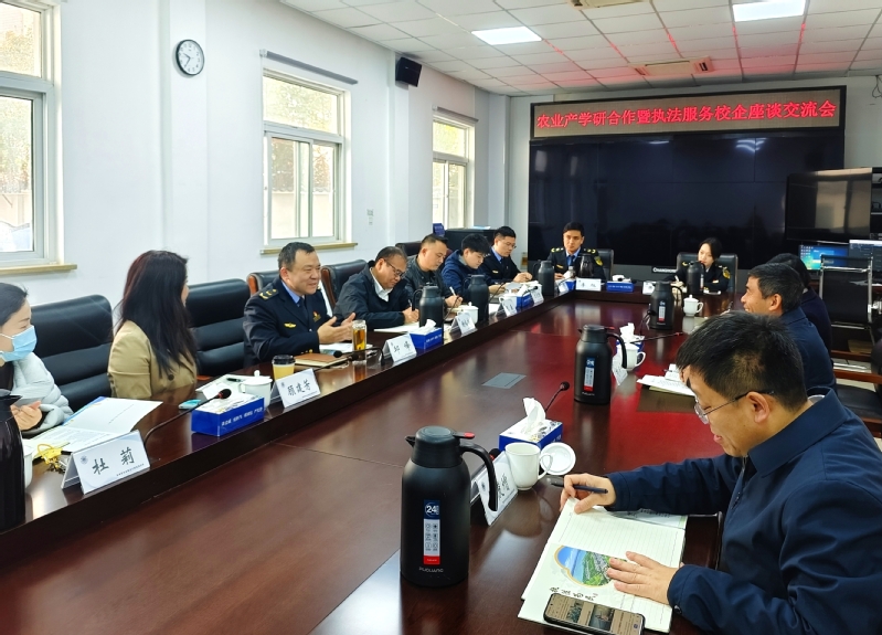 与苏州市农业综合行政执法支队、苏州市农业科学院、倍思特食品有限公司、苏州久富农机有限公司、安佑生物科技集团研究院、苏州东山茶厂股份有限公司、江苏育成禾集农业科技发展有限公司等单位的座谈交流会,由苏州市农业综合行政执法支队支队长邱峰主持。他高度评价了学院办学成果,希望进一步深化产学研融合,共同探索人才培养新路径。各单位负责同志分别介绍了企业发展现状与技术创新方向,并围绕人才培养模式改革、科研项目联合攻关、科技成果转移转化等方面展开深入探讨。大家一致表示将充分发挥各自优势,加强深层次校企合作,以人才共育、科技创新服务地方经济社会发展。