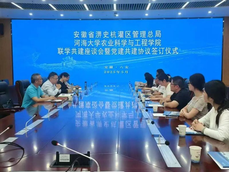 在安徽省淠史杭灌区管理总局,师生先后参观了安徽省淠史杭灌区灌溉试验总站、淠史杭灌区淠河总干渠三十铺管理分局、数字灌区调度中心,深入了解特大型灌区的建设背景以及发展史。座谈会上,安徽省淠史杭灌区管理总局党委书记、局长吕平详细介绍了淠史杭灌区基本情况、建设管理情况、改革与发展成就以及未来的发展计划,期望共建双方围绕中心工作,定期联络,优势互补,平台共建,充分弘扬“自力更生、顽强拼搏、牺牲奉献、科学求实”的淠史杭精神,培养和输送优秀人才。农业科学与工程党委书记刘兴平首先对淠史杭灌区管理总局表示感谢,强调双方有着深厚的历史渊源,希望以本次活动为契机,带领师生走出校园,感受一线水利人的奋斗精神。同时,希望双方在党建共建、科技合作等方面加强合作。随后,双方举行党建共建签约仪式。