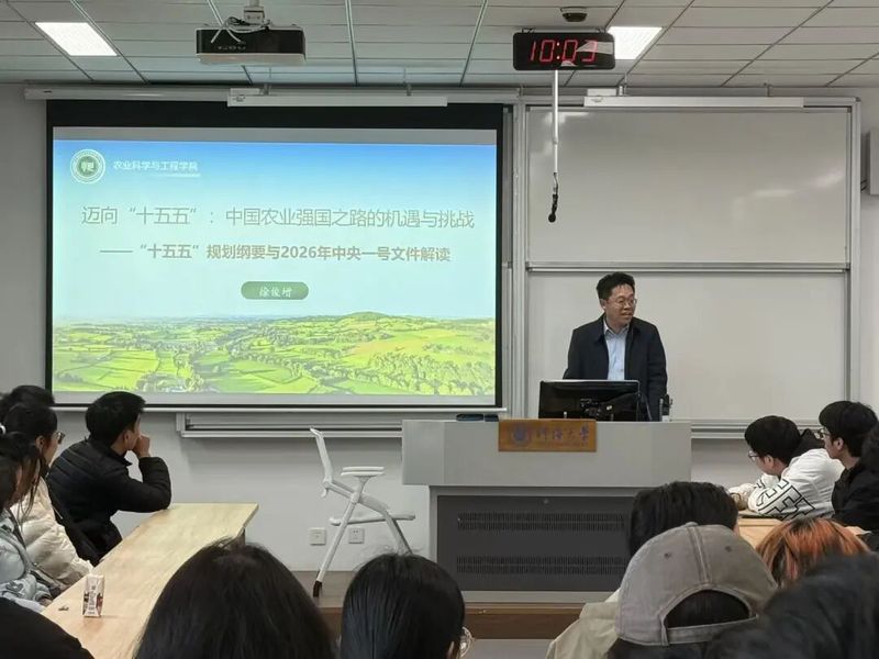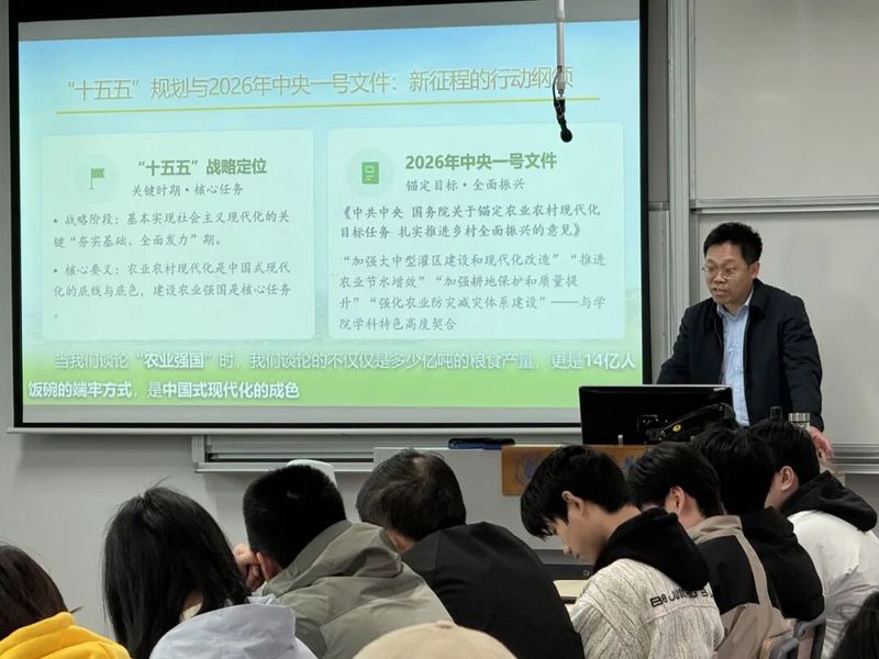 院长立足“十四五”农业发展成绩单,结合2026年中央一号文件,用详实的数据、鲜活的案例,系统梳理了“十四五”期间我国农业综合生产能力、脱贫攻坚成果、农民收入、乡村建设等方面的重大成就——粮食产量连续两年稳定在1.4万亿斤以上,农业科技进步贡献率超64%,主要粮食作物已基本实现全程机械化,让同学们直观感受我国农业发展的坚实基础。徐院长还围绕“十五五”规划与中央一号文件明确的“四项重点任务、两大支撑保障”,结合政策原文与权威数据,向同学们阐述了“十五五”时期农业强国建设的机遇与挑战。