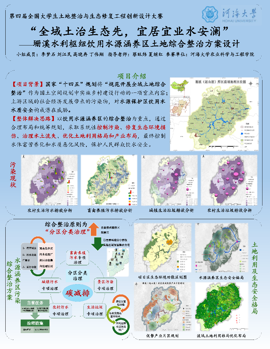 本次大赛以“综合整治·绿色低碳·乡村振兴”为主题,自比赛启动以来,我院组织院内专家对初赛项目作品进行认真审核把关,并选派了5支队伍代表我院参加本次大赛决赛。最终由朱成立、冯宝平老师指导,贺俊达等同学设计的作品《“控源截污保清水,稻香满畴绿无涯”基于NbS的“稻田-沟道-池塘”协同生态系统修复规划与设计》荣获大赛特等奖;由冯根祥、盛丽婷老师指导,陈宗霖等同学设计的作品《“盐碱转绿,农田新光”——江苏省三仓片区盐碱地改良及高标准农田建设规划》荣获大赛特等奖;由王策、冯根祥老师指导,陈昱成等同学设计的作品《“碳净田园,绿绘堰桥”——无锡市惠山区堰桥街道低碳绿色田园综合体空间规划》荣获大赛一等奖,由李金刚、陈菁老师指导,蔡心悦等同学设计的作品《“农渔协作治盐碱,水肥高效开新篇”盐碱地复合生态改良——以宁夏平罗县盐碱地改良为例》荣获大赛一等奖,由蔡旺炜、夏继红老师指导,李梦石等同学设计的作品《“全域土治生态先,宜居宜业水安澜”——珊溪水利枢纽饮用水源涵养区土地综合整治方案设计》荣获大赛二等奖。